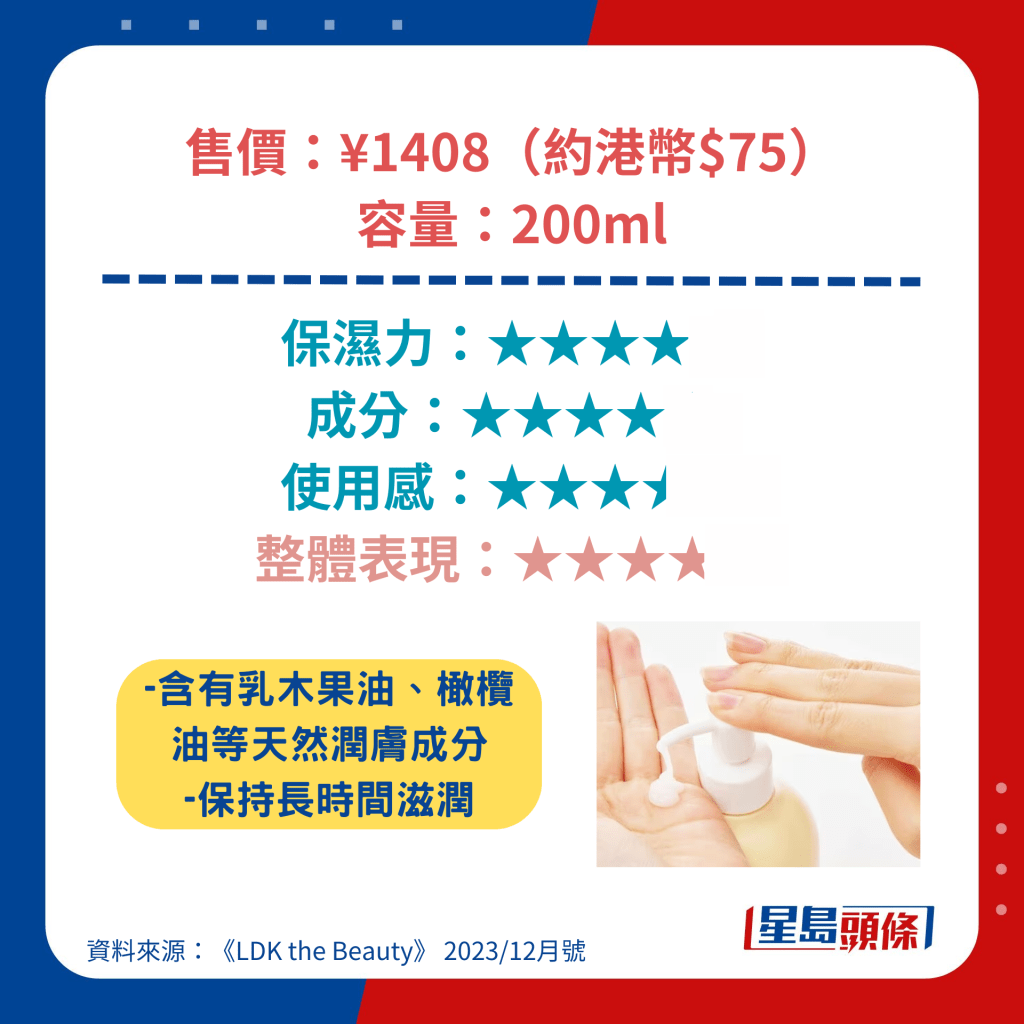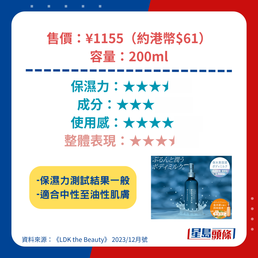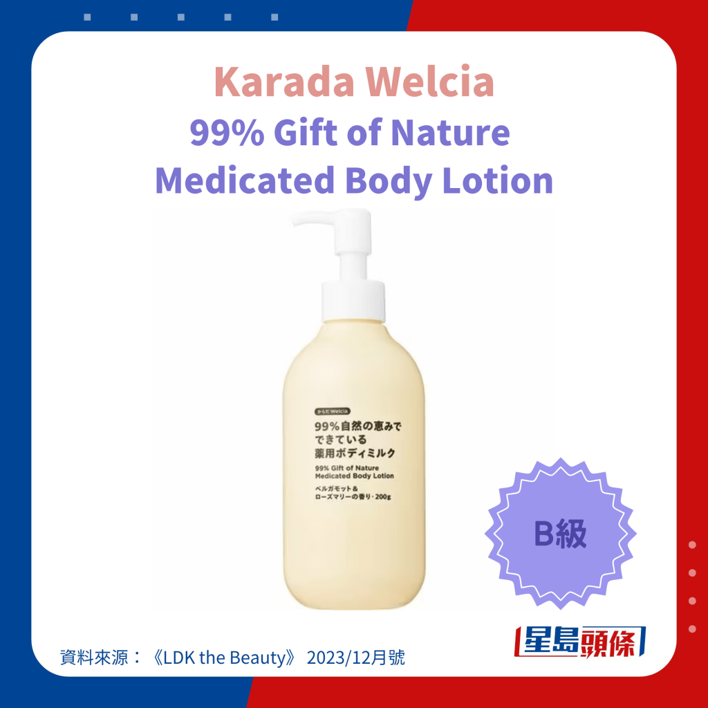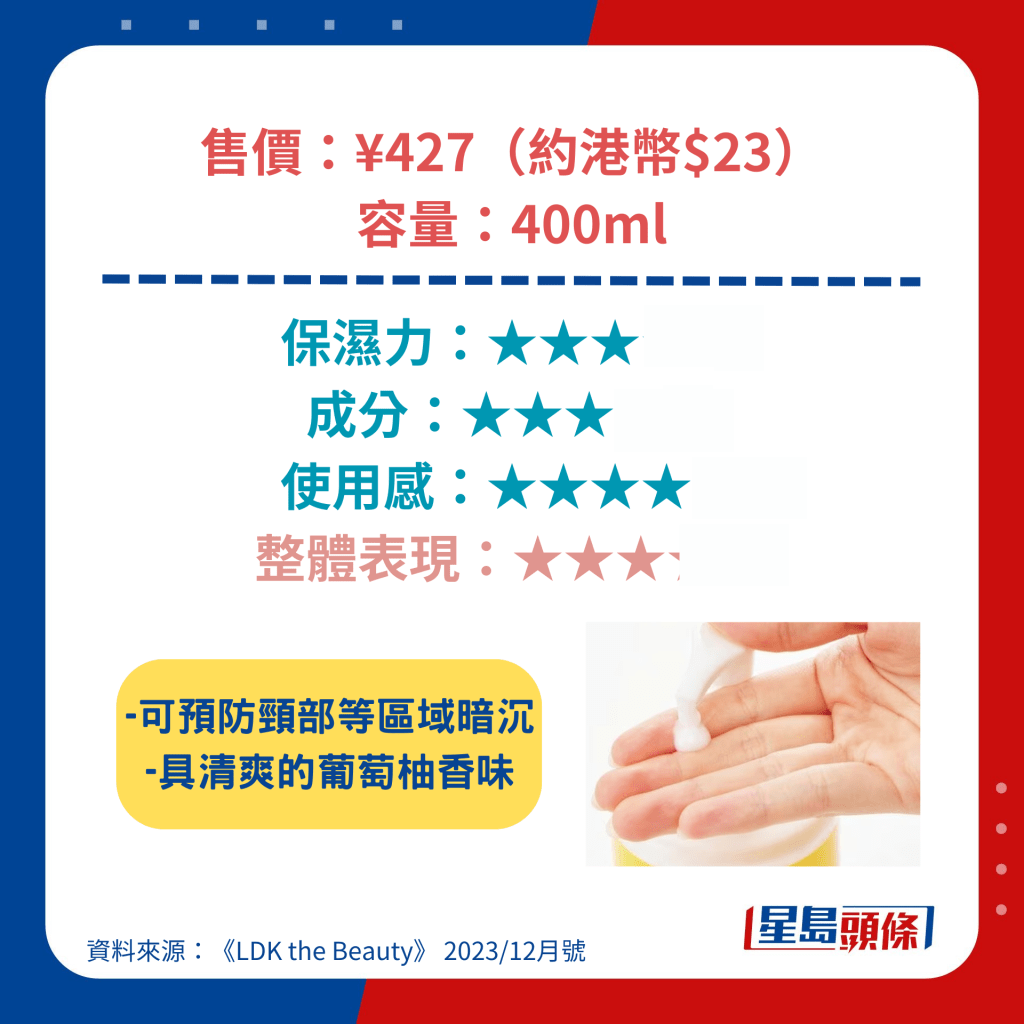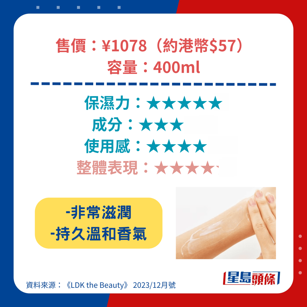 冬季天气干燥,不少人都会使用身体润肤露(Body Lotion)去滋润肌肤,避免出现龟裂及痕痒等问题。 日本杂志《LDK the Beauty》找来专家及多名用家实测23款人气身体润肤露,其中更包括港人熟悉的NIVEA、雪肌精、Neutrogena等品牌。 评测中有多达6款产品获A级评分,而最高评分的身体润肤露更低至44元人民币,有着超高性价比。