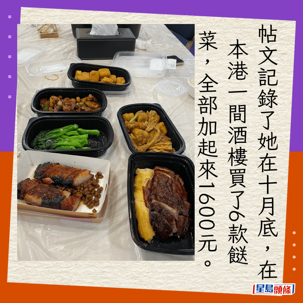 ▲帖文记录了她在十月底,在本港一间酒楼买了6款菜,全部加起来1600元。