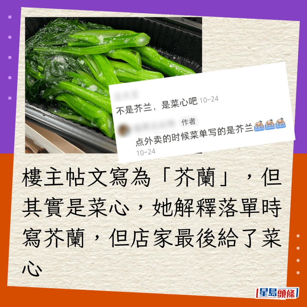 ▲楼主帖文写为“芥兰”,但其实是菜心,她解释落单时写芥兰,但店家最后给了菜心