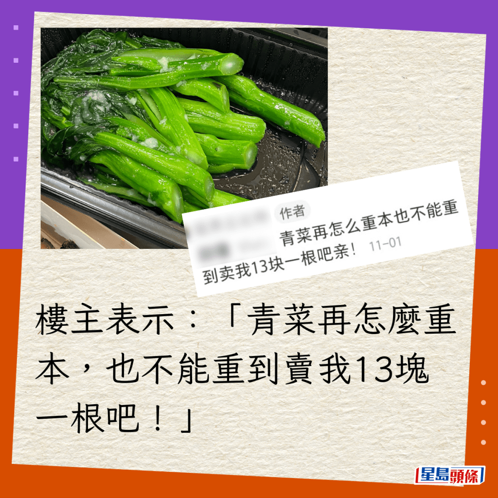 有内地女子赴港指,在中环花了1600元买外卖(港元,下同),当中一碟菜心约有10条,收取130元,引起网民关注,楼主表示:“青菜再怎么重本,也不能重到卖我13块一根吧!”