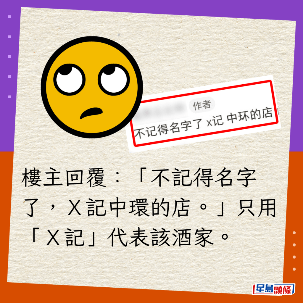 ▲楼主回覆:“不记得名字了,X记中环的店。” 只用“X记”代表该酒家。