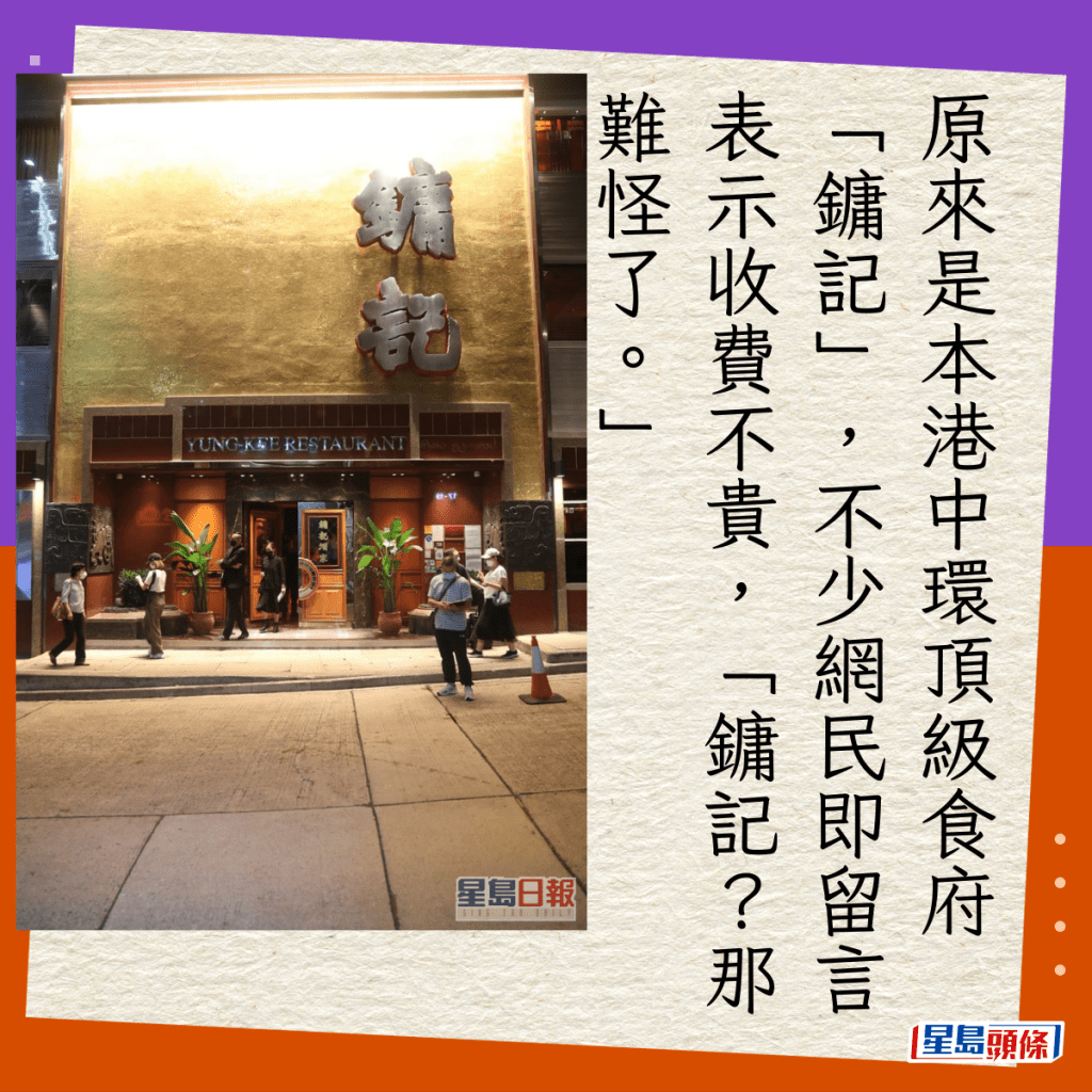 ▲原来是香港中环顶级食府“镛记”,不少网民即留言表示收费不贵,“镛记? 那难怪了。”