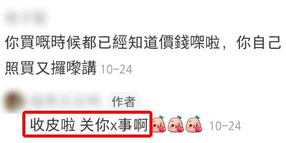 不少网民留言询问:“你买边间?”楼主先讲:“不记得名字了。”其后透露了这间在中环的酒家名字,以下是楼主就事件和网民的互动过程,面对质疑,楼主甚至曾以粗口回应:“收皮啦,关你X事啊。”