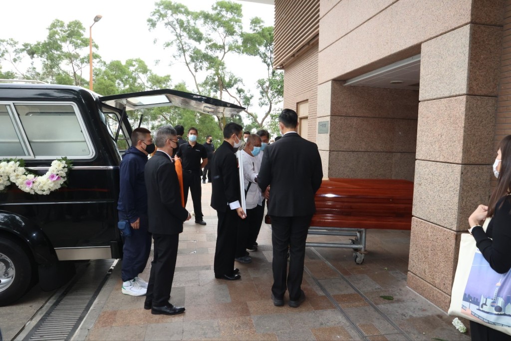 ▲刘德华在工作人员护送下从灵车步往礼堂。