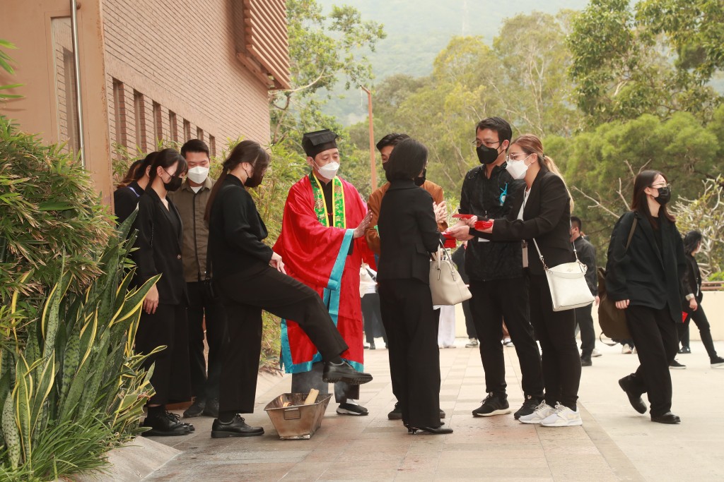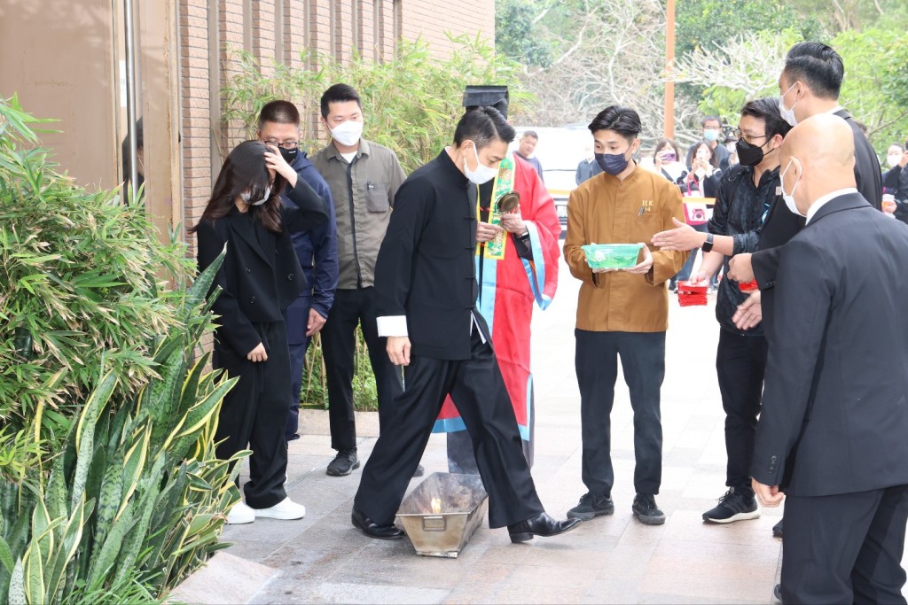 ▲接着刘德华带头槛过火盆、以碌柚叶水洗手。