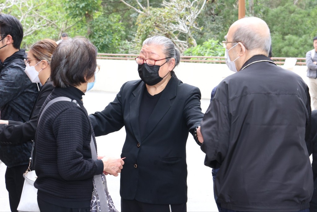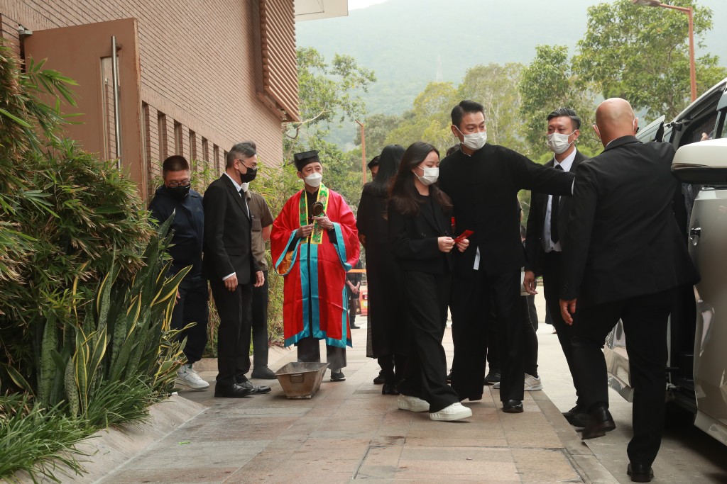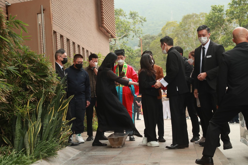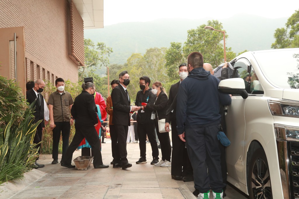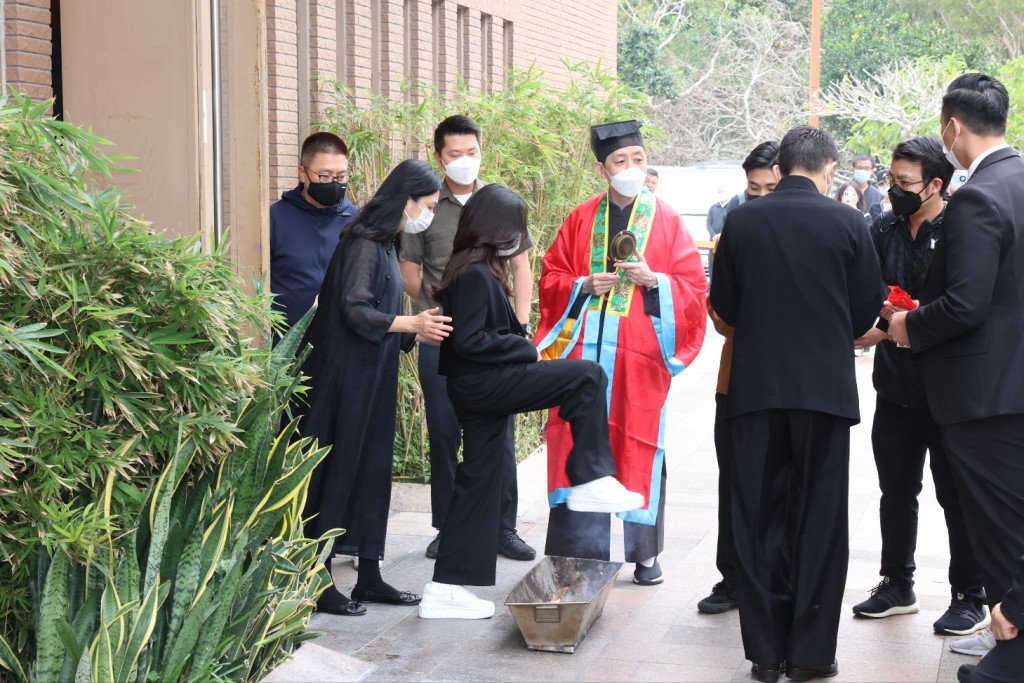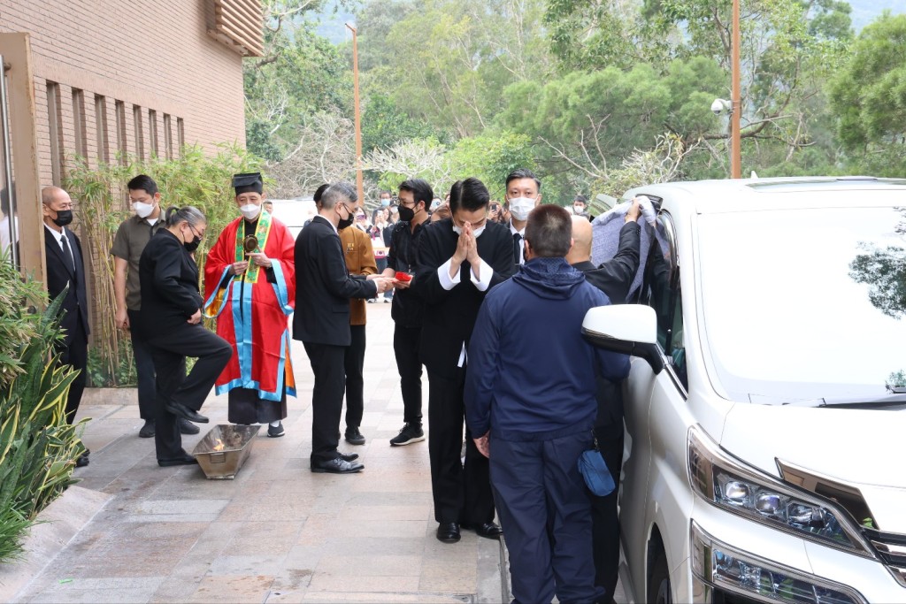 仪式大约半小时结束,随后颂经师傅先步出礼堂,接着刘德华带头槛过火盆、以柚子叶水洗手,接过工作人员准备的缨红利是后,即转身照顾纪紧随其后的囡囡和太太。完成送别爸爸最后一程,眼红红的刘德华先让妻女上车,再向传媒双手合十,最后登上保母车离开火葬场。刘德华胞姊则招呼尾随的亲友,并一同乘坐旅游巴离开。
