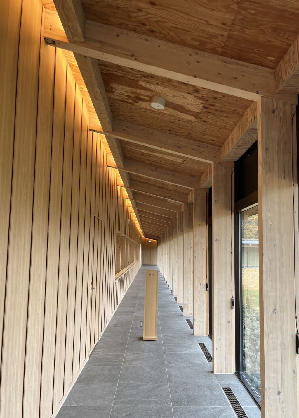 ▲一道装置了大型玻璃窗的长廊,将室外的自然景观引入室内。