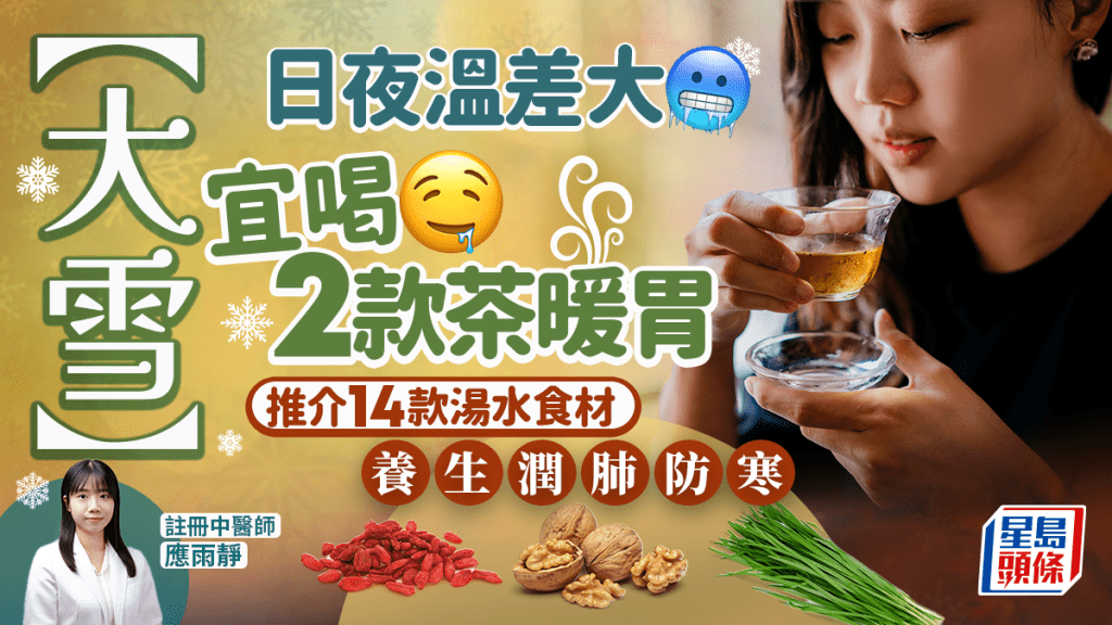 大雪节气养生2023|今天(12月7日)是二十四节气的“大雪”,也是冬季的第三个节气。注册中医师应雨静接受《星岛头条》访问时指,大雪气温持续下降,气候干燥,容易受寒气侵袭而引起各种疾病。应医师教大雪养生宜忌,例如忌“棉被盖头”,忌吃鱼生等。另她亦推介14款大雪汤水及食材,防寒润肺,有助保持健康。