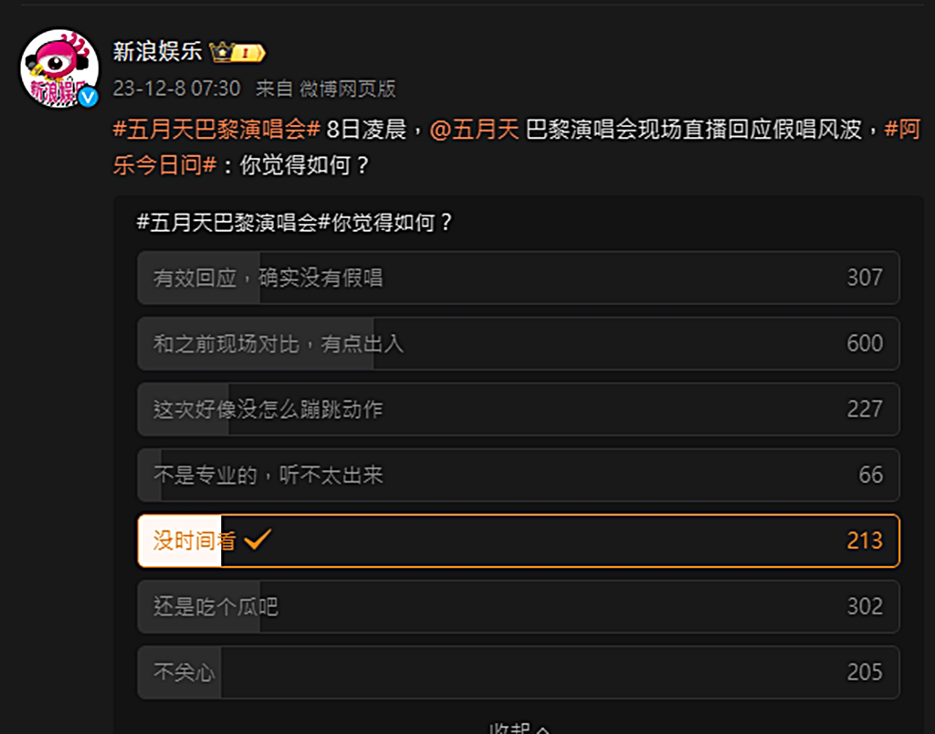 五月天近期在各地忙开巡回演唱会,先前到上海开唱时,相关音档引来大陆2名博主比对质疑假唱,引发轩然大波,稍早巴黎演唱会直播结束,《新浪娱乐》举行投票询问网友反应,结果约有600人认为仍跟之前现场对比有出入,307人认为确实没有假唱,另有227人认为“这次好像没怎么蹦跳动作”,其余网友则表示听不出来或没时间看,投票总人数约1920人。