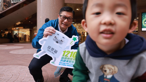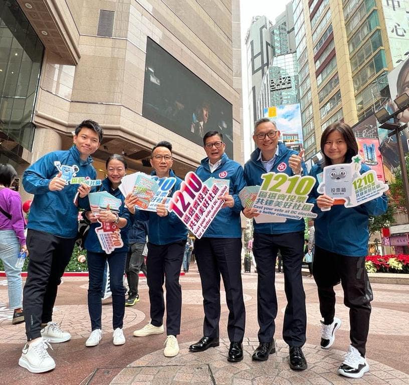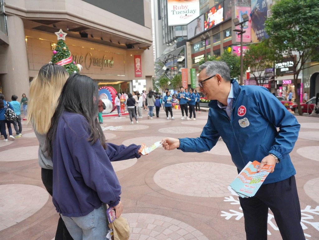 公务员事务局推区选手机贴图让巿民“揿个掣”宣传,邓炳强铜锣湾派传单吁“几忙都要拣”
