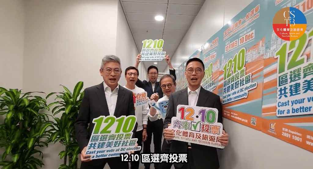 杨润雄亦在社交平台发表影片,片中杨润雄伙同文体旅局副局长刘震、常任秘书长黄智祖、体育专员黄德森及政治助理招文亮拍片,再次提醒文体旅局同事记得12月10日区议会选举投票,而投票当日更确保值班的同事可以投票。