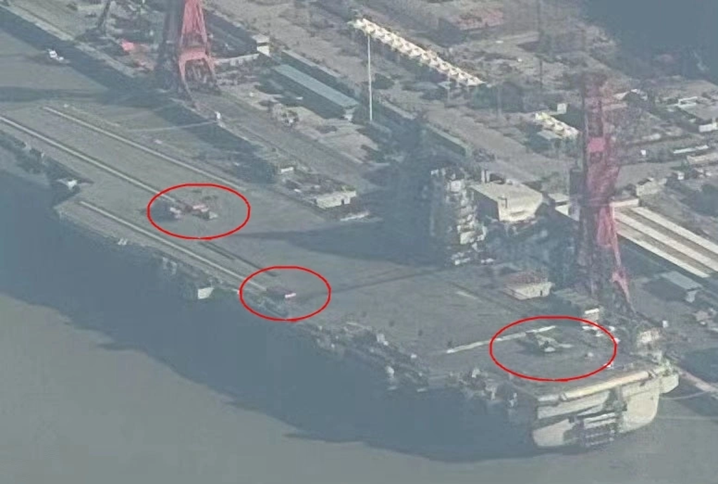 ▲长兴岛船坞内的福建舰被拍到明显地有2部小红车正同时测试电磁弹射,而在甲板后端有一架形似歼-35的飞机也已经上舰预备参与测试。(图:腾讯网)
