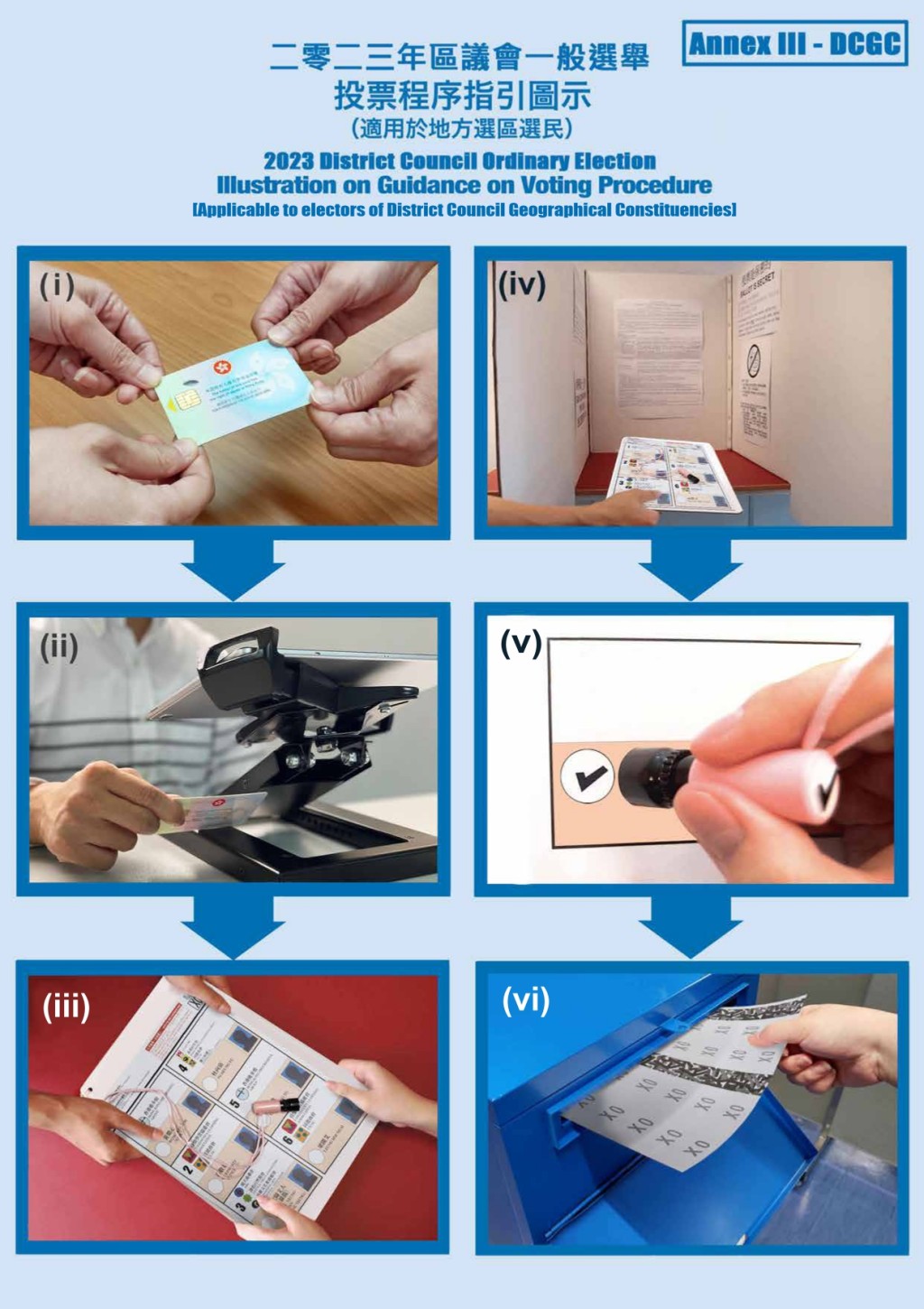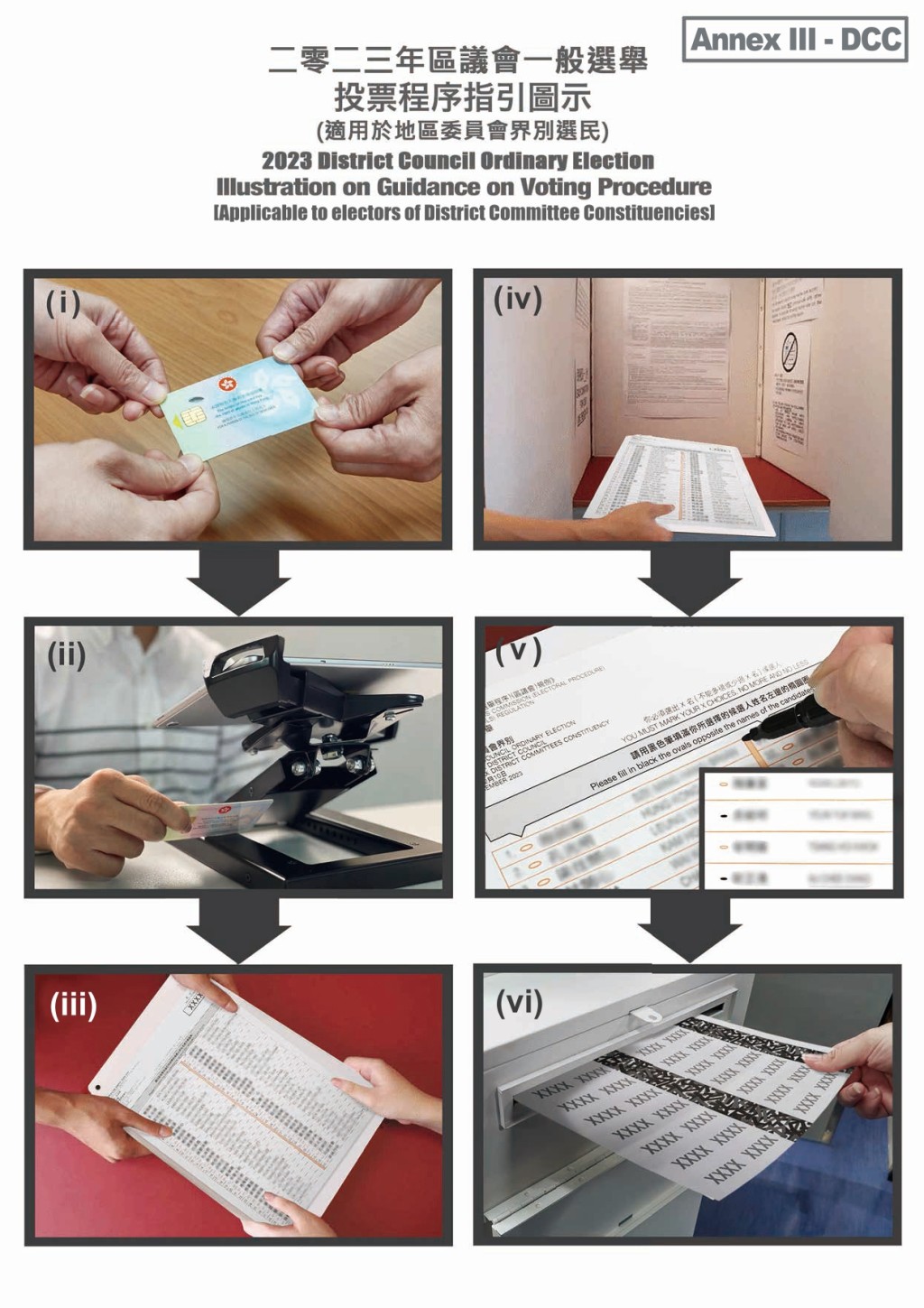 选民到票站后,向工作人员出示身份证或指定替代文件如特区护照等,经核实后,选民将获发选票,投票后将选票放入票箱。政府提醒选民切勿在选票上盖两个剔号,否则会令选票无效。