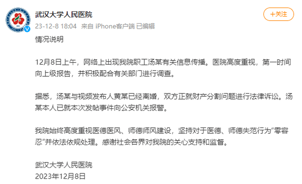 武汉大学人民医院8日在官方微博指,高度重视事件,已第一时间向上级报告,并积极配合有关部门进行调查,强调“零容忍”医生失德,会依法依规处理。