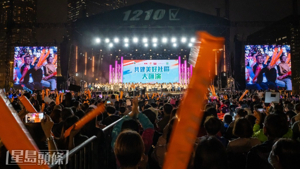 香港“区选缤纷日”重点活动“共建美好社区大汇演”9日晚上7点在西九文化区竹翠公园揭开序幕,有逾百歌手表演。众主持先献唱主题曲《狮子山下 共建美好社区》。政务司司长陈国基、财政司司长陈茂波、律政司司长林定国、政务司副司长卓永兴、政制及内地事务司局长曾国卫、民政及青年事务局局长麦美娟、房屋局局长何永贤、公务员事务局局长杨何蓓茵、创新科技及工业局局长孙东、运输及物流局局长林世雄、商务及经济发展局局长丘应桦、劳工及福利局局长孙玉菡、教育局局长蔡若莲等特区官员都在台下撑场。