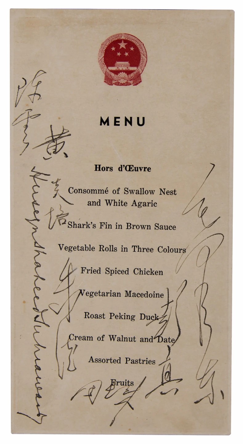 这份英文菜单上有毛泽东、周恩来、彭真、朱德、陈云等当时中共领导人的钢笔签名。当天的国宴菜肴包括燕窝白木耳清汤、红酱鱼翅、三色蔬菜卷、炸五香鸡、素蔬果冻、北京烤鸭、核桃枣奶油、什锦糕点、水果。