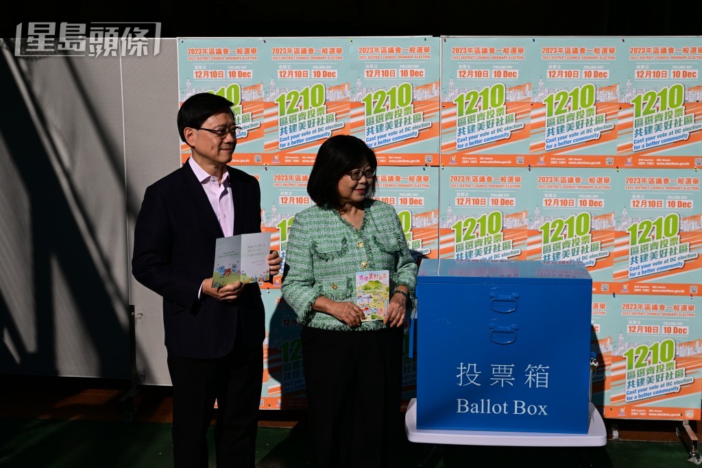 ▲李家超与太太到高主教书院票站投票。