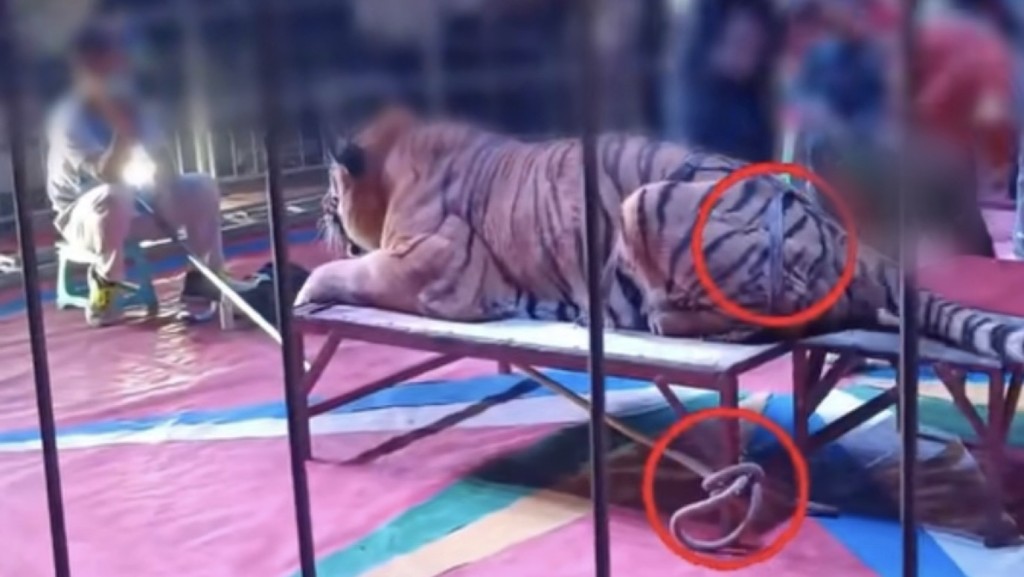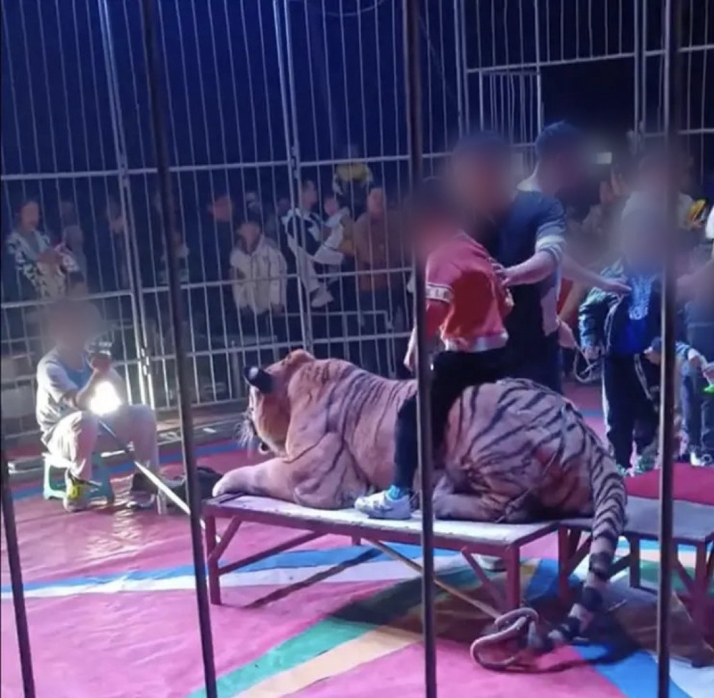 网友于12月6日上载影片,片中一只老虎趴在铁床上,一名男子将小男孩抱起放到老虎背,前方有专人拿相机拍照。老虎后肢用皮带固定,但拍照时它的前肢和尾巴还在摆动,旁边有不少孩子排队等候拍照。据悉收费为20元人民币一张照片。