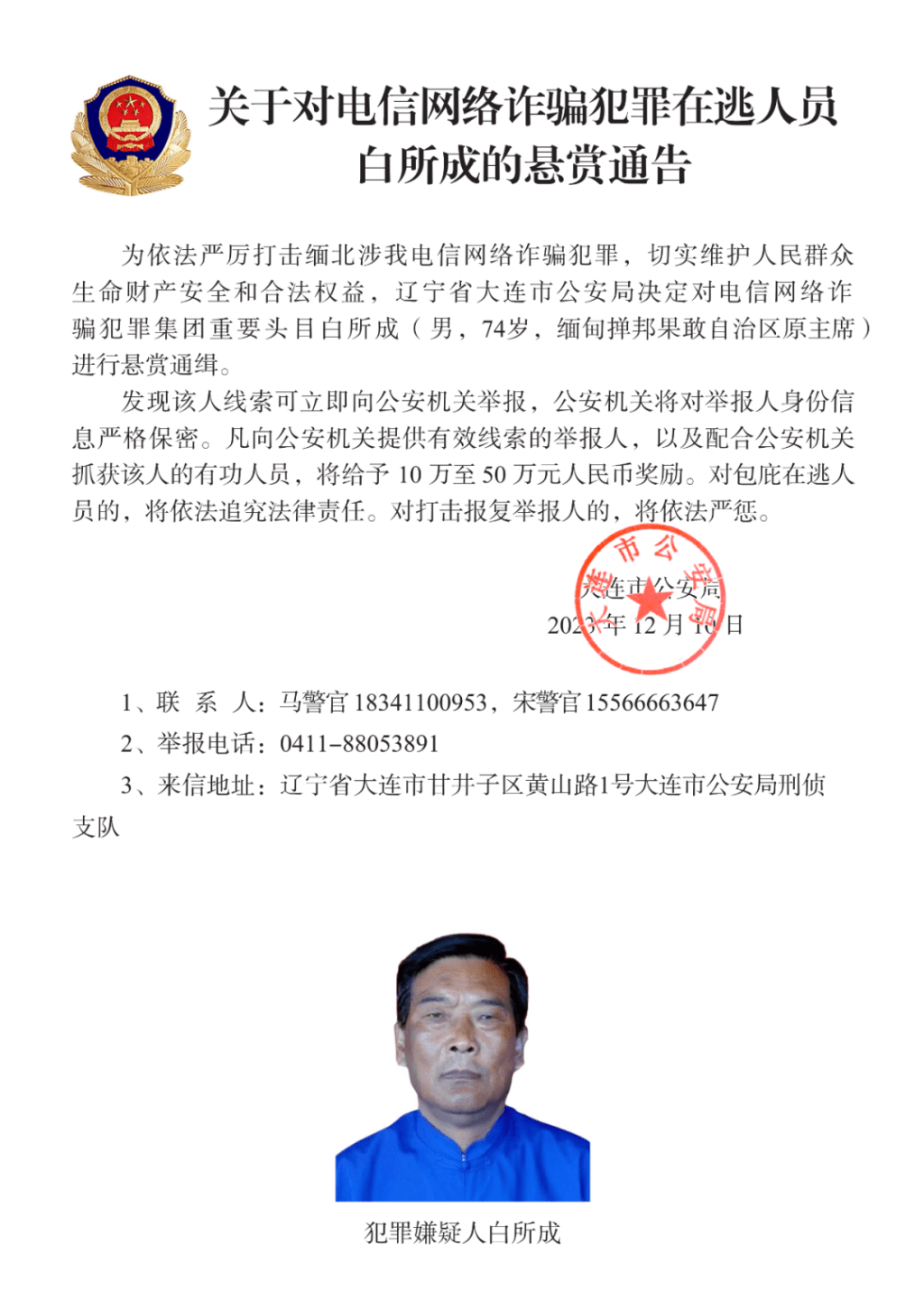 大连市公安局决定公开悬赏通缉白所成、白应苍(又名李云晨)、白应兰(又名李梦娜)。通缉令显示,74岁的白所成是果敢自治区前主席,白应苍、白应兰应是其子女。