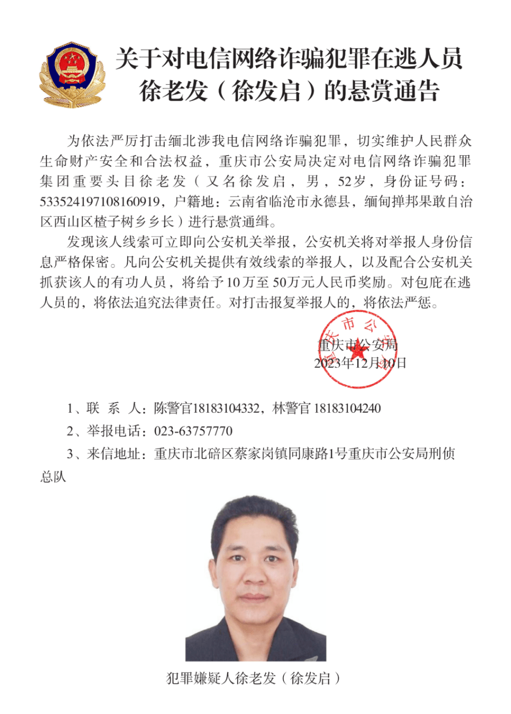 重庆市公安局决定对徐老发(又名徐发启)进行公开悬赏通缉。徐老发是果敢一名乡长。