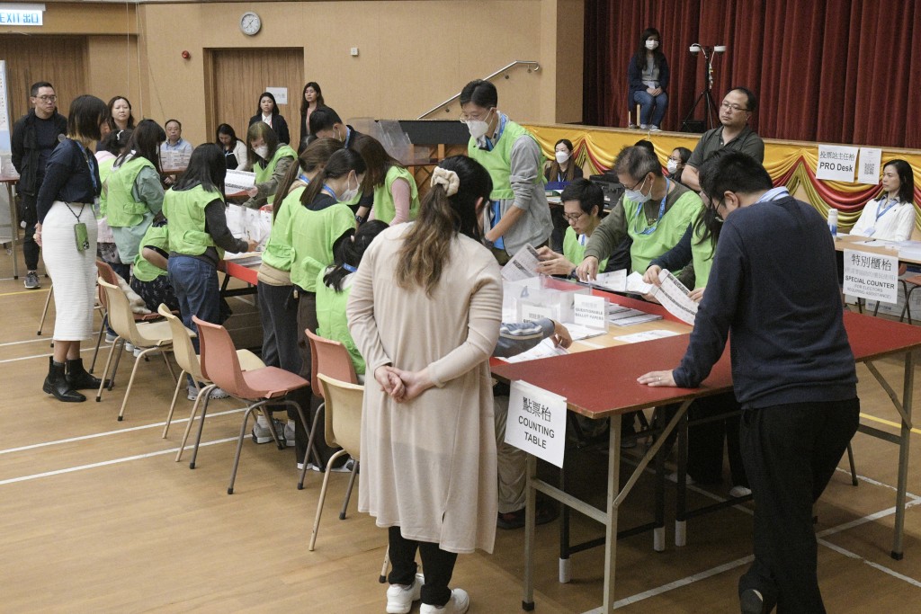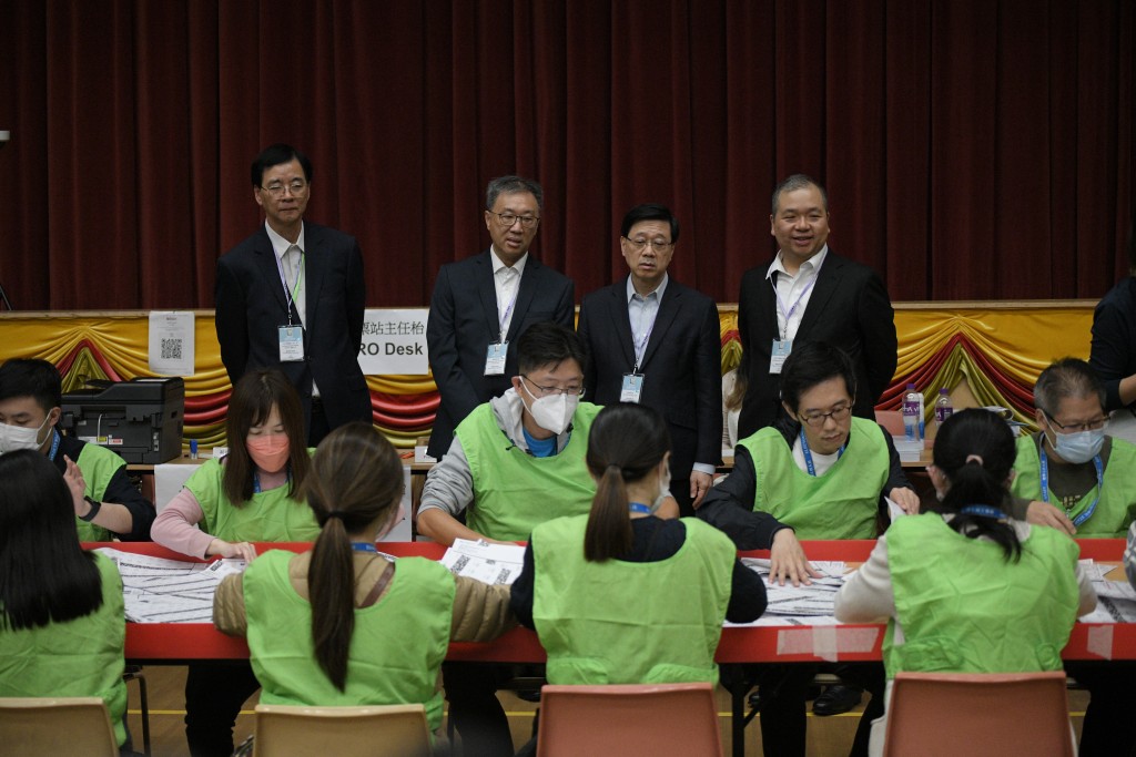 ▲香港行政长官李家超、陆启康法官、石丹理教授和文本立资深大律师到香港铜锣湾高士威道120号皇仁书院点票站巡视及倒出票箱中的选票。
