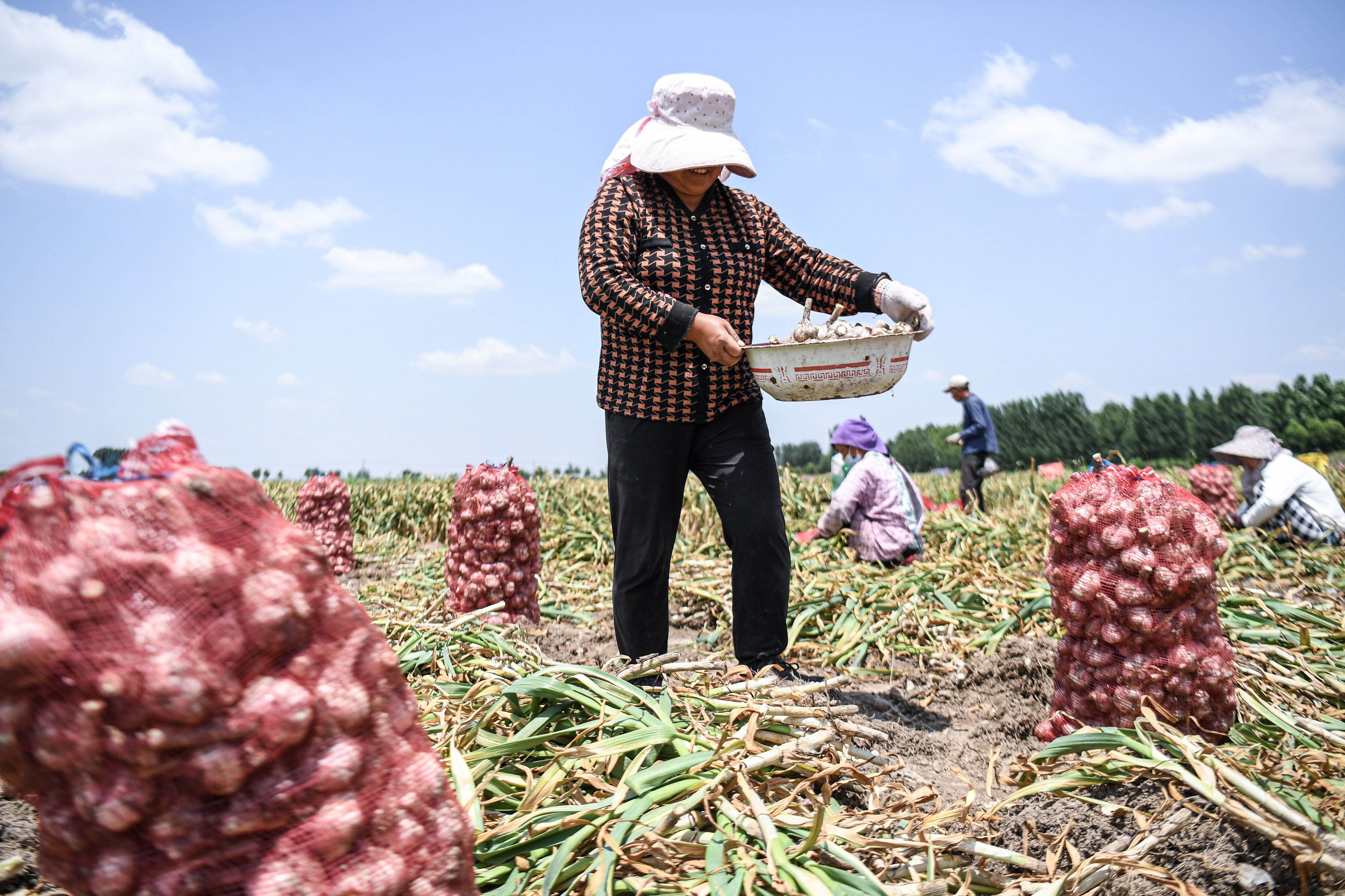 ▲河南省郑州市中牟县村民在田间采收大蒜。新华社资料图片