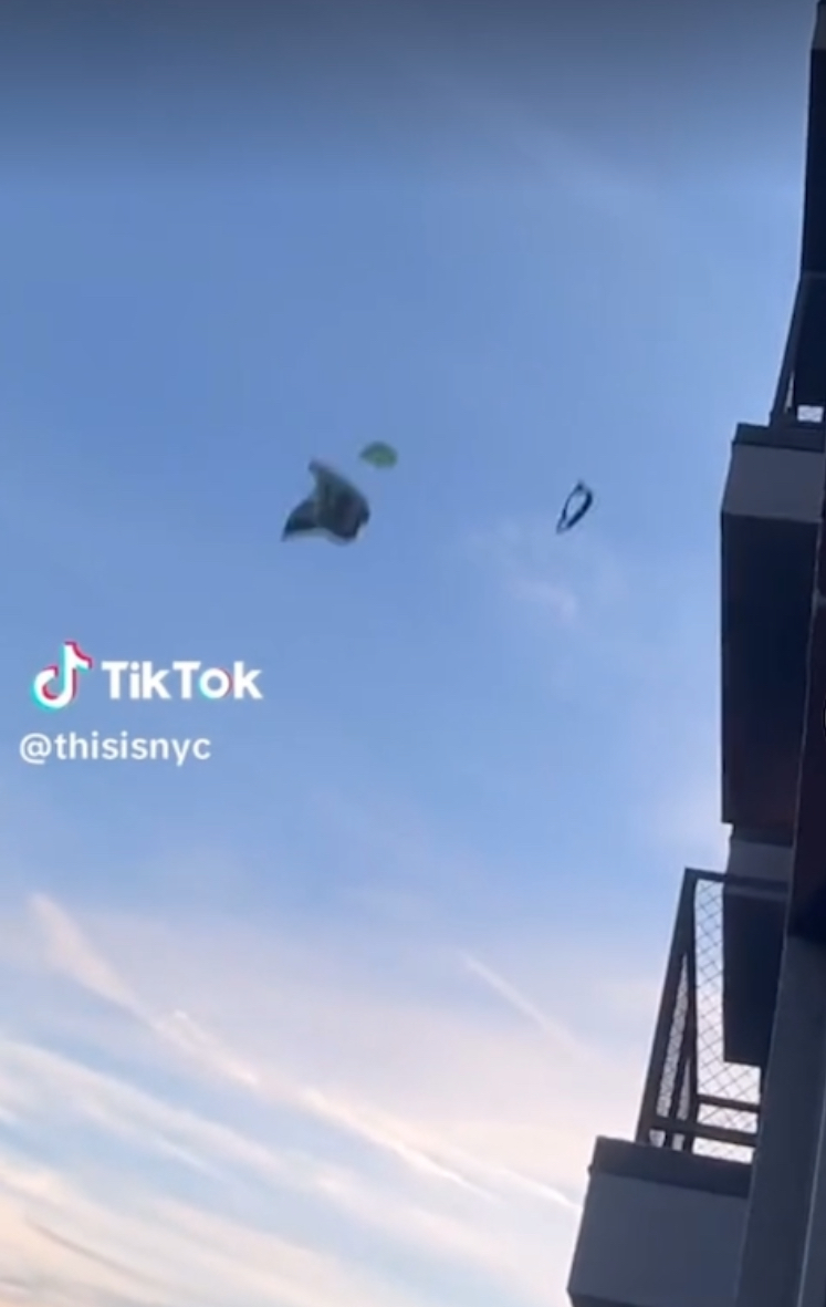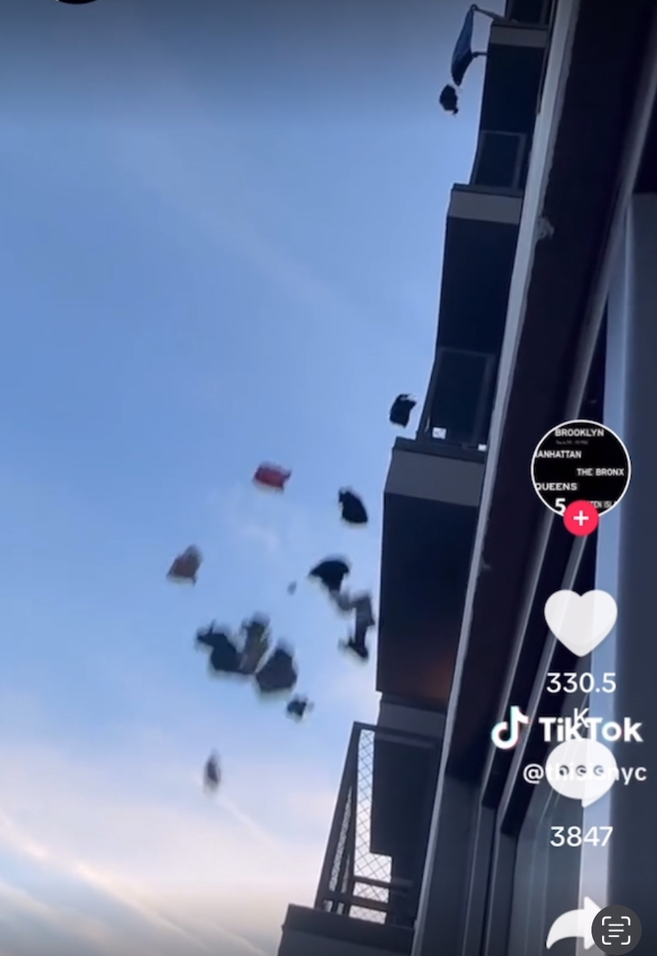 ▲女子发狂将捉奸在床的男友衣物丢落街,其中一条裤子“倒竖葱”飘逸。 TikTok