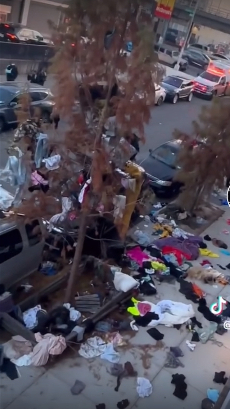 现场照片显示﹐除了衣服,散落在路上的物品还有化妆品、花瓶、长椅、一面镜和一厨房小用具。拍片者笑说“他很幸运,没有被扔下去”、“女子叫的像在玩过山车”、“她想把街道树装饰成圣诞树”、“那男人的衣物还真多。”