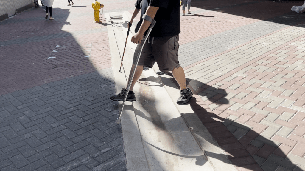 ▲有撑拐杖人士小心翼翼地跨过坑渠。