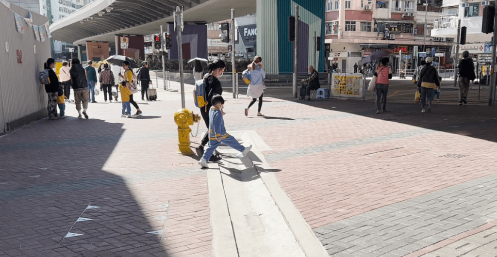 Leo提及的行人路位于九龙城道6号对出,该处为一幅行人公共空间,惟中间却出现一条超阔坑渠,路人经过时都需要大步跨过去,当中不乏用拐杖或拉着手拉车的长者,而轮椅人士甚至需要“兜路行”;当幼稚园返学放学时段,有小朋友在该处跑跳嬉戏,较年幼的学童在跨过坑渠时,明显有难度。