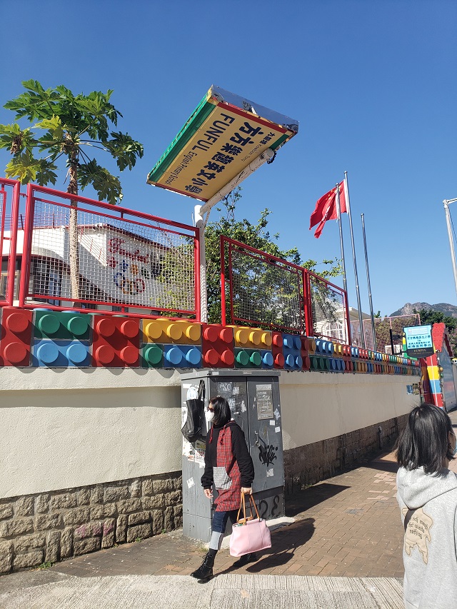 ▲九龙塘方方乐趣英文小学长方型招牌打后空翻,对途人构成危险。陈兆龙摄