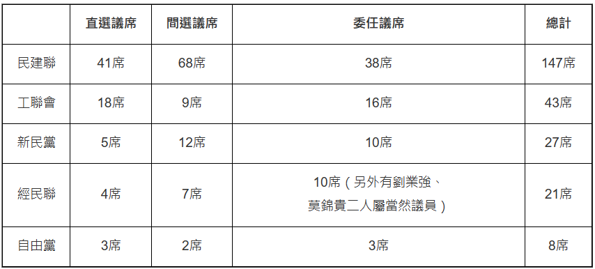 《星岛头条》整理全港五大政团直选、间选及委任议席,民建联成为今届区选大赢家,该党在44个直选选区羸得41席,加上间选赢得68席,以及有38人获委任,豪取147席,成为区议会第一大党。