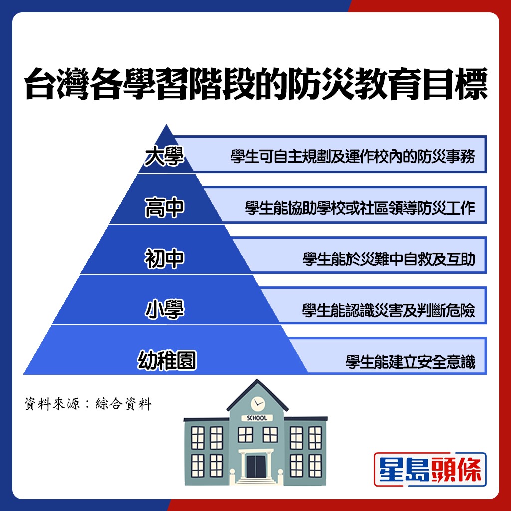 备受地震、风灾威胁的台湾,各学习阶段均设防灾教育,当中幼稚园着重培训安全意识,小学要认识灾害,初中生需能自救等,盼做到“防灾重于救灾,离灾优于防灾”。香港赛马会灾难防护应变教研中心去年曾发布《幼稚园推行防灾教育课程的成效与挑战》的研究报告,发现颱风、水浸及火警是首3位最被受访幼稚园教师及家长认知的灾害;受访者亦认同需要推行幼儿防灾教育,并让家长参与其中。