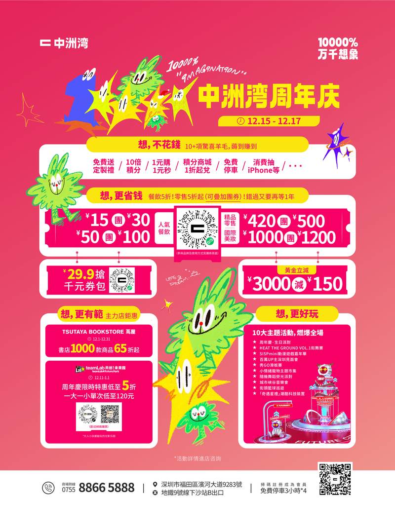 中洲湾随处可见科技狠活,不仅有占地3000㎡的潮玩店、华南首家 “茑屋”、teamLab共创!未来园,还有遍地的艺术品,彷佛打造了一座全新的 “未来城市”。今年中洲湾周年庆更是 “卷翻天”,不仅现场有10大主题活动,一次性玩到爽!还额外送出10多项惊喜羊毛:1元购1元秒、餐饮/零售5折券等等,省钱更不花钱!