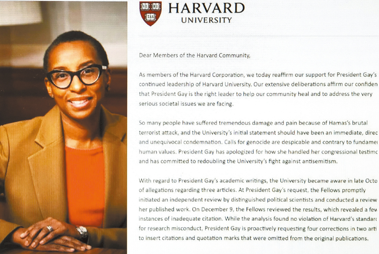 ▲哈佛大学董事会发表声明,重申支持校长盖伊继续领导哈佛大学,该校在11日晚上举行特别董事会会议之后,发表声明一致支持校长。FPJ图片
