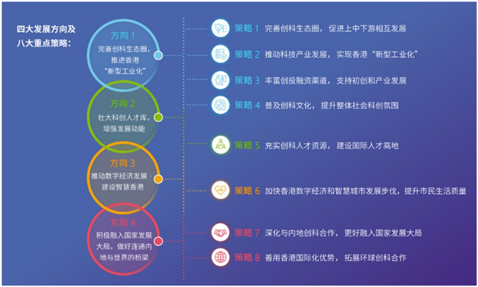 《香港创新科技发展蓝图》明确了科创发展的四大方向,提出了八大重点策略,为未来5至10年的香港科创发展制定清晰的发展路径和系统的战略规划。