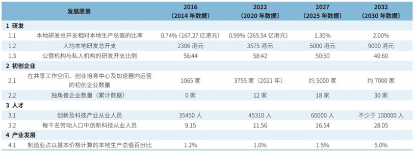▲香港科创发展愿景参考指标表。来源:《香港创新科技发展蓝图》