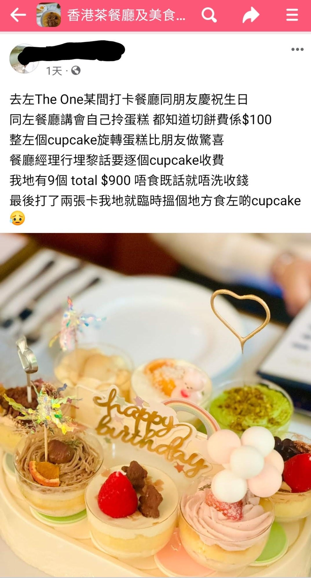 据该网民透露,她早前与友人光顾尖沙咀The One某间打卡餐厅,与朋友庆祝生日,她们也预早通知餐厅会自携蛋糕前往,并知道切饼费为$100。怎知当餐厅经理看见蛋糕后,即说要收取$900切费费,比原本的切饼费足足贵了9倍!据该网民透露,原来她当天“整左(咗)个cupcake旋转蛋糕比朋友做惊喜。”该蛋糕上共有9个cupcake,餐厅经理看见后便说“要逐个cupcake收费。”合共便是$900,若不吃的话则毋须收费。结果该网民与友人只是打了卡,然后便携走蛋糕再找地方与朋友享用。