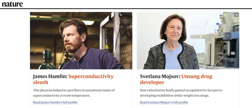 《自然》今年上榜人物包括:印度空间研究组织“月船3号”项目副主管卡尔帕纳·卡拉哈斯蒂(Kalpana·Kalahasti);美国国家点火装置首席设计师安妮·克利切(Annie·Kritcher);日本大坂大学的发育生物学家林克彦;OpenAI公司首席科学家、人工智能先驱伊尔亚·苏茨克维(Ilya·Sutskever);巴西环境部长玛丽娜·席尔瓦(Marina·Silva);联合国首位全球首席高温官埃莱尼·米尔维利(Eleni·Myrivili);寄生虫学专家哈利杜·廷托(Halidou·Tinto);伦敦圣巴多罗买医院癌症研究员托马斯·波尔斯(Thomas·Powles);生物化学家斯韦特兰娜·莫伊索夫(Svetlana·Mojsov);美国佛罗里达大学物理学家詹姆斯·哈姆林(James·Hamlin)。