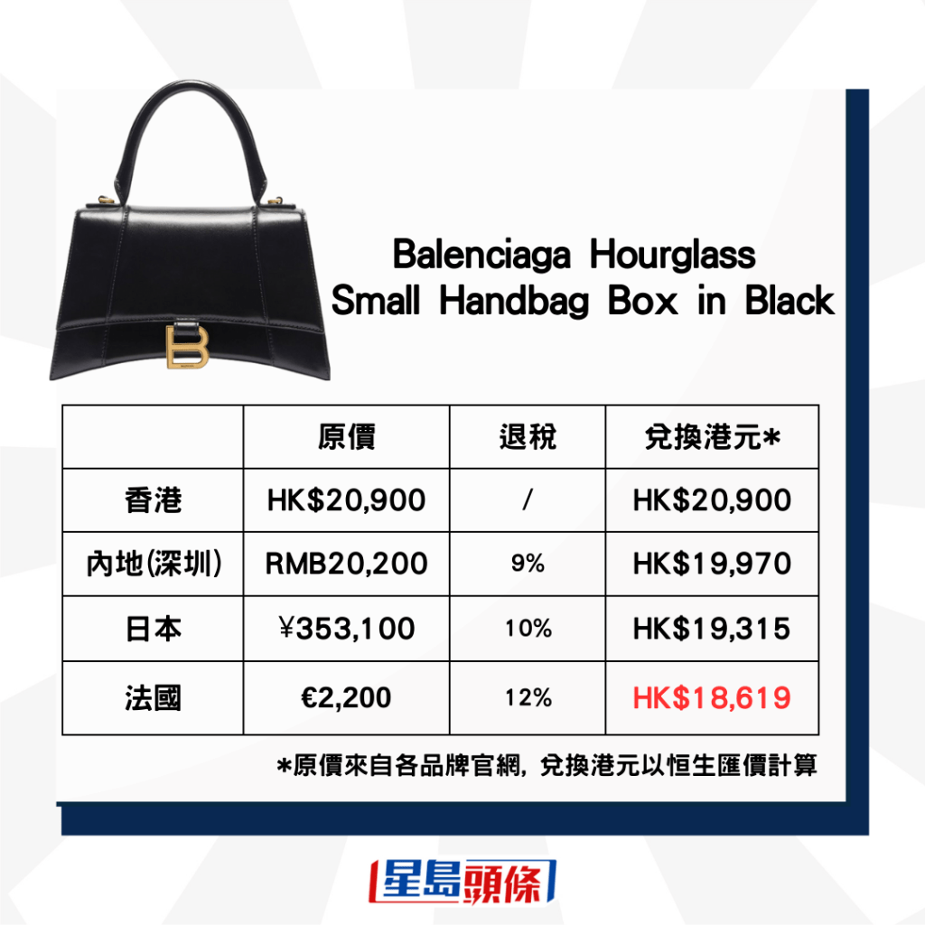 另外,巴黎世家旗下的Hourglass黑色闪亮光滑牛皮革小号沙漏包,向来备受市场追捧,于香港官网的现价为20,900元,价格同样高于另外三个市场。该款手袋在深圳、日本及法国市场的退税及换算汇率后价格分别为19,970、19,315及18,619元。