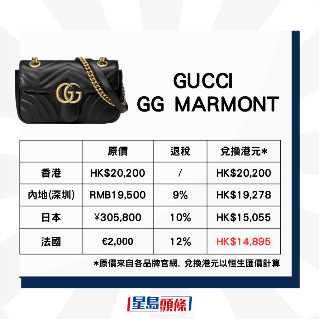 此外,Gucci经典GG MARMONT小型绗缝肩背袋在香港官网的现价为20,200元,于内地官网现价则为19,500人民币,经9%退税及换算汇率后约19,278元。
