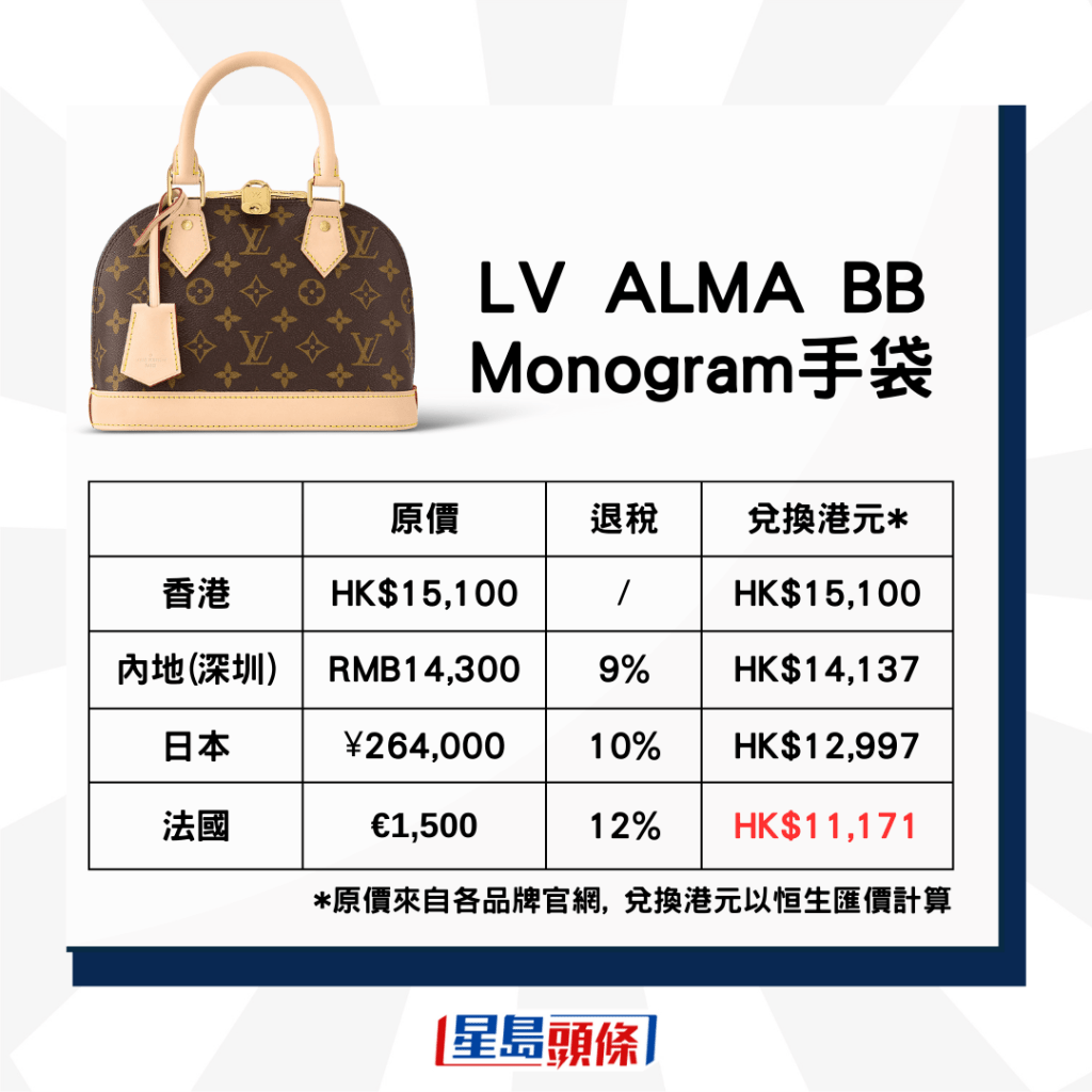 记者以被视为最保值的LV经典老花名牌手袋之一Alma BB手袋作比较,在香港官网现价为15,100元,同一款手袋在内地官网现价则为14,300人民币。若深圳未有“即买即退”优惠,港人北上买手袋在换算汇率后约15,536元,价格就比香港贵;如今港人于深圳试点商店购买,计及9%退税及换算汇率后约14,137元,即较香港价格便宜近千元。至于Alma BB手袋在日本及法国官网的现价则为264,000日圆及1,500欧元,退税及换算汇率后分别为12,997元及11,171元。