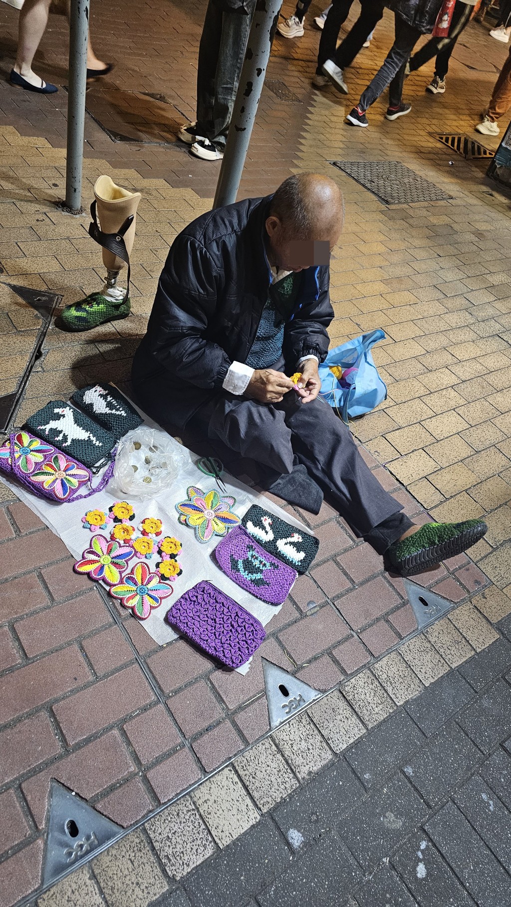 旺角砵兰街则有一名年长男子在街头摆卖冷线编织而成的手工艺术品,他卸下右脚义肢,背靠路牌坐在地上,并摆上一个装有数枚硬币的胶袋,其间一直埋头苦干编织,状甚专注。记者上前搭讪,对方以普通话说“给我点钱买饭吃”,但拒绝透露是否从内地来港。