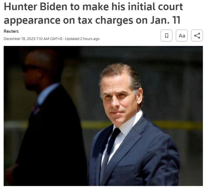据路透社18日报道,法庭文件显示,美国总统乔·拜登的儿子亨特·拜登将于2024年1月11日就税务指控,在洛杉矶首次出庭。