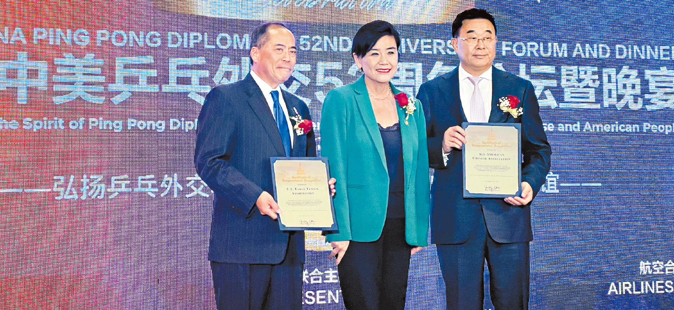 由美国南加州华人华侨联合总会、美国乒协、中国驻洛杉矶总领馆联合主办,纪念中美乒乓外交52周年论坛暨庆祝晚宴,20日在洛杉矶工业市(City of Industry)太平洋棕榈度假酒店(Pacific Palms Resort )隆重举行。当晚,2023中美乒乓外交杯友谊赛A、B组获奖队、美国乒乓球公开赛的部分获奖运动员受邀出席,并为友谊赛举行颁奖典礼。