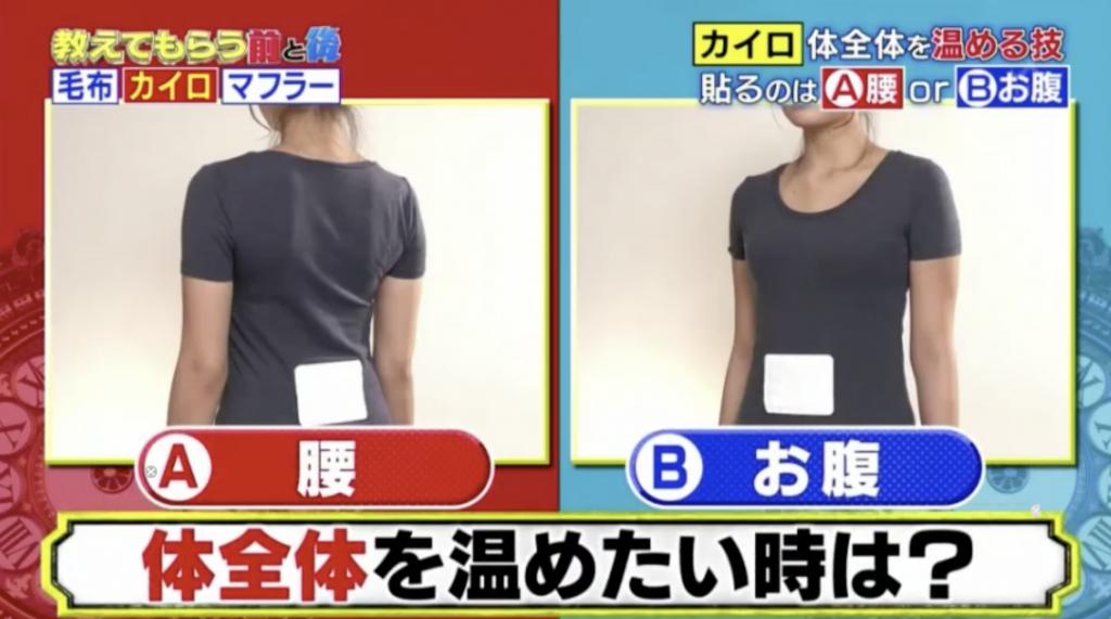 ▲暖包最好紧贴腹部,会比起贴在腰间更暖。(图片来源:《教えてもらう前と后》节目截图)