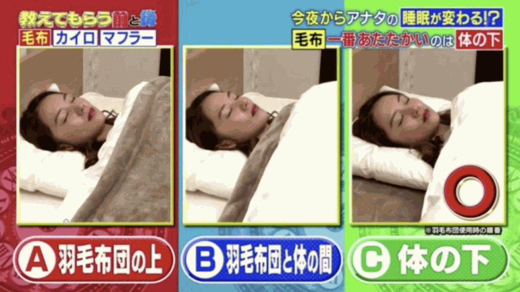 ▲专家比拼3种盖被方法。(图片来源:《教えてもらう前と后》节目截图)