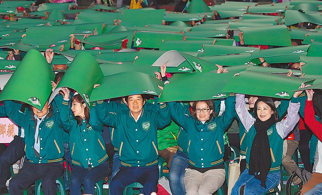 ▲赖清德(中)、萧美琴(右二)24日出席“唱土地的歌,拼咱的希望”台北场,与“立委”候选人及民众一起高举纸板拼出环岛拼图中的“美”字。中国时报