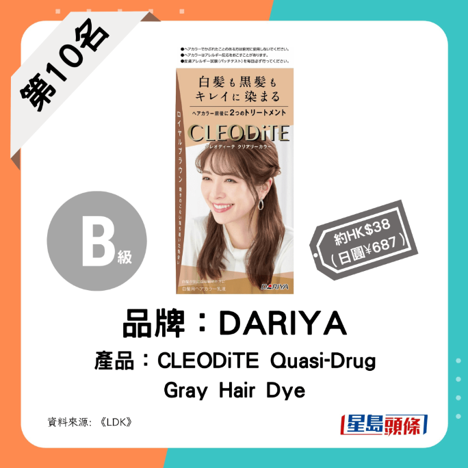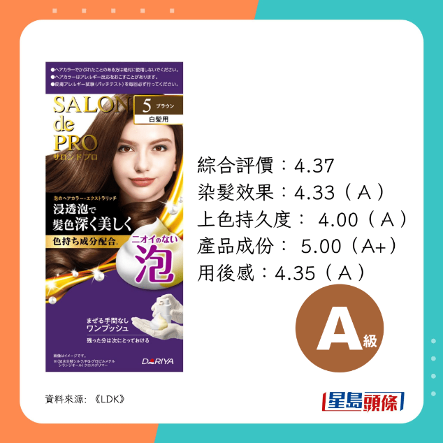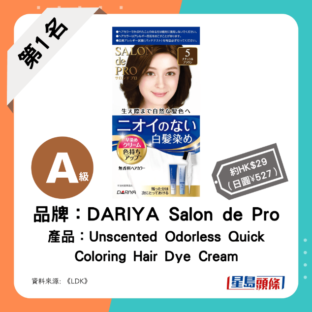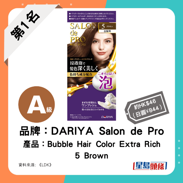这次《LDK》测试中,最获推介的A级的白发专用染发剂同样为“DARIYA”品牌的产品,分别为“Salon de Pro Bubble Hair Color Extra Rich”及“Salon de Pro Unscented Odorless Quick Coloring Hair Dye Cream”。 两款产品不但含多种滋润和修复头发的成分,而且使用方便简单、上色持久度高。