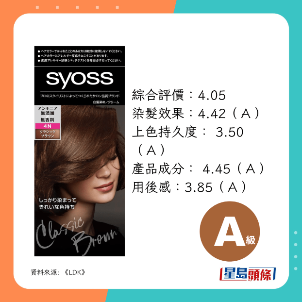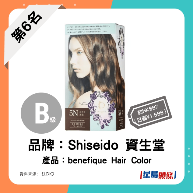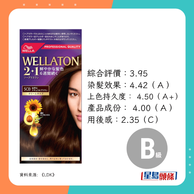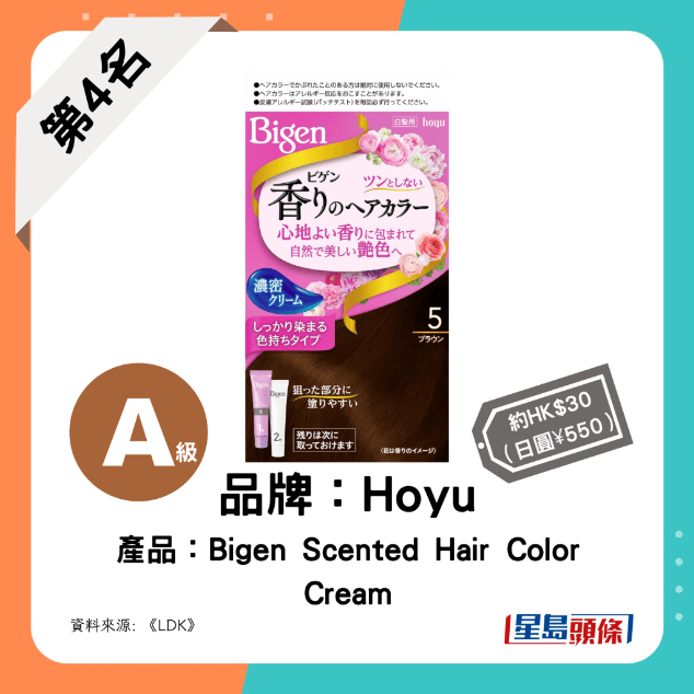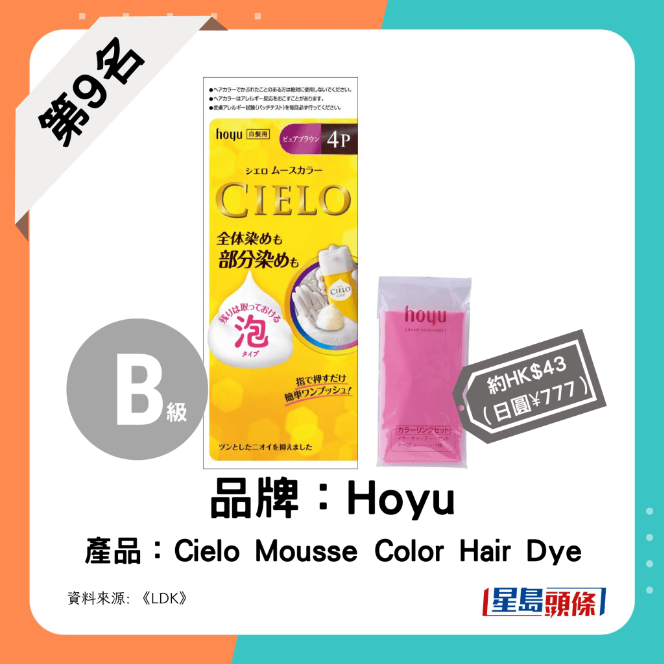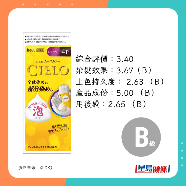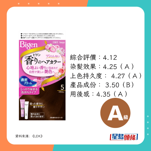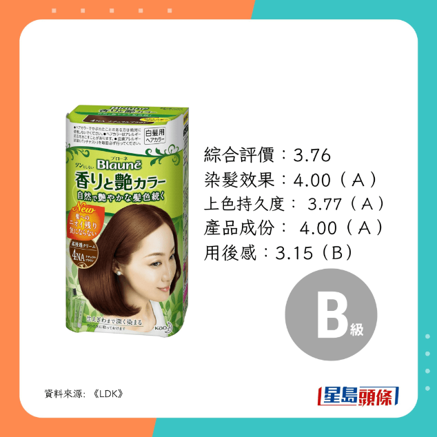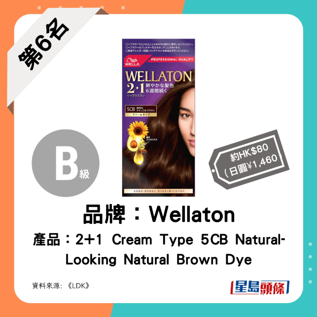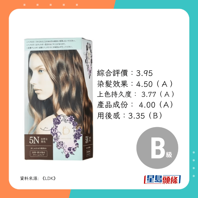 根据《LDK》白发专用染发剂的评测结果,10款染发剂之中,有5款相对出色,获评为A级,不但染色能力佳、持久度高、含有修护头发的成分,而且易于使用。 排名如下(由低至高):